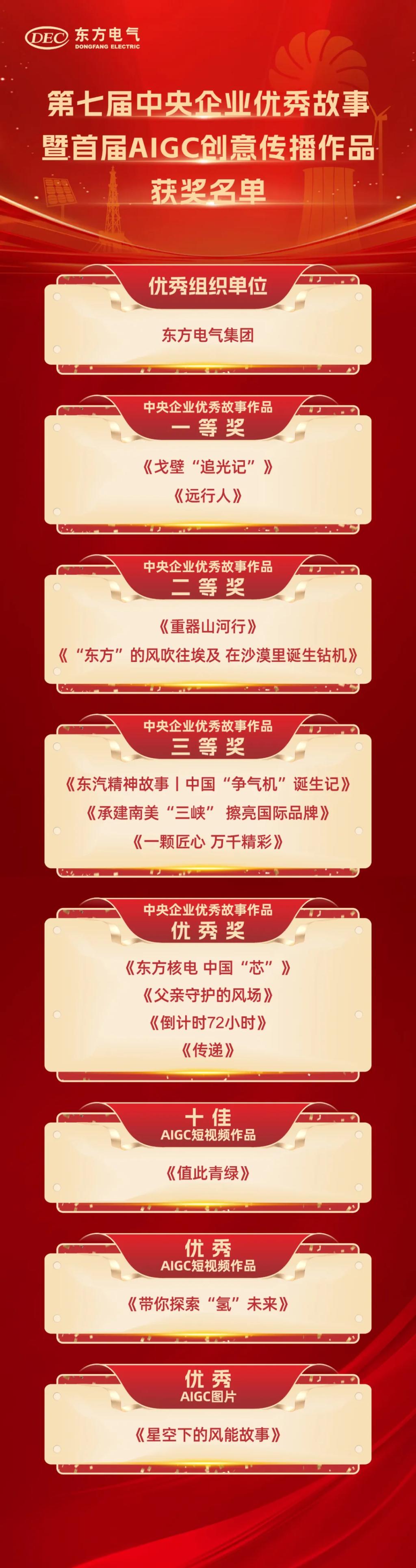 其中,《戈壁“追光记”》《远行人》荣获中央企业优秀故事作品一等奖,《重器山河行》《“人生就是博官网”的风吹往埃及 在沙漠里诞生钻机》荣获中央企业优秀故事作品二等奖,《东汽精神故事丨中国“争气机”诞生记》《承建南美“三峡”擦亮国际品牌》《一颗匠心 万千精彩》荣获中央企业优秀故事作品三等奖,《人生就是博官网核电 中国“芯”》《父亲守护的风场》《倒计时72小时》《传递》荣获中央企业优秀故事作品优秀奖,《值此青绿》获评十佳AIGC短视频作品,《带你探索“氢”未来》获评优秀AIGC短视频作品,《星空下的风能故事》获评优秀AIGC图片。